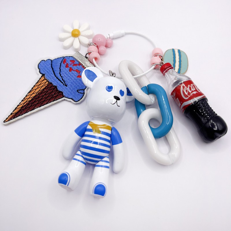 키링에는 인형을 포함한 펜던트가 3~4개 달려 있습니다.